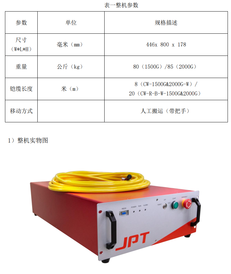 杰普特光纖激光器的光輸出端采用水冷 QBH 輸出,具備高品質(zhì)的光束質(zhì)量,穩(wěn)定的功率輸出,為配合安裝調(diào)試,我們?cè)冢?000W 的機(jī)型安裝有滾輪和吊裝環(huán),對(duì)≤3000W的機(jī)型安裝有把手,請(qǐng)選擇合理的搬運(yùn)方式來移動(dòng)和安裝產(chǎn)品;如表一。
